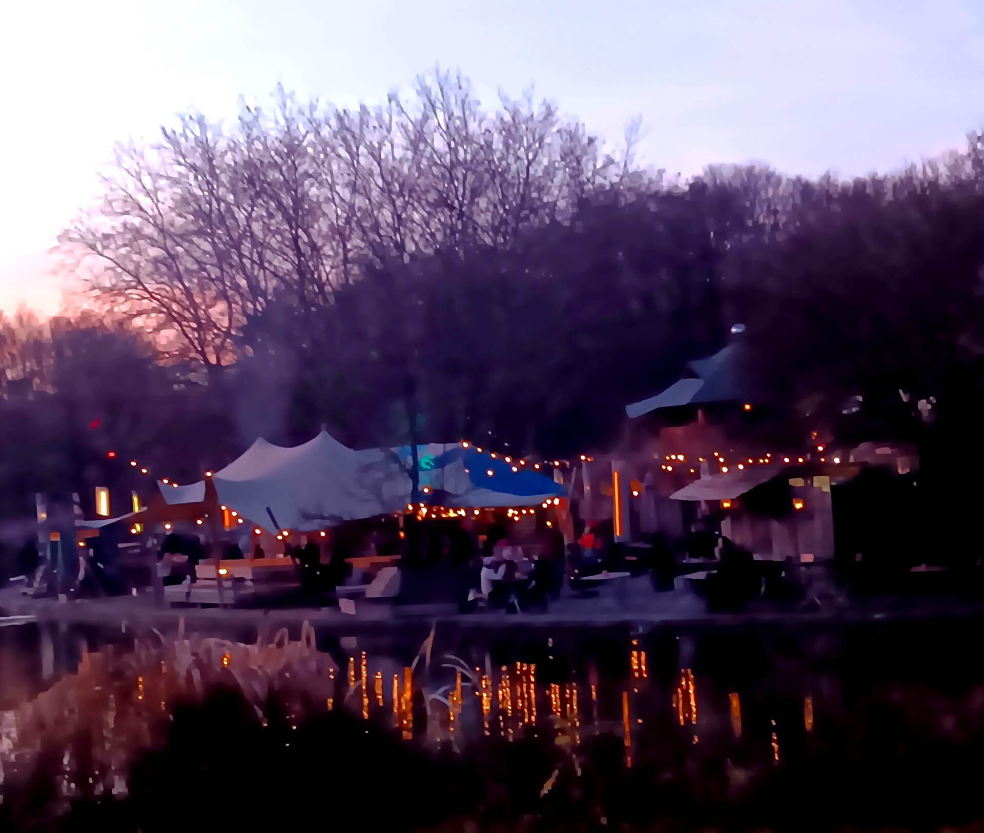Langsam bekamen wir Lust auf ein heißes Getränk. In der Ferne sahen wir schon die Lichter des „Winterzaubers“ beim Freiluftcafé „Gans am Wasser“ am Mollsee. Nix wie hin! Jede holte sich was zu trinken. Wir fanden einen Tisch in der Nähe des Wassers. Feuerschalen wärmten diejenigen, die das Glück hatten, in der Nähe zu sitzen. Wir aber hielten es auch ohne die wärmende Glut gut aus!