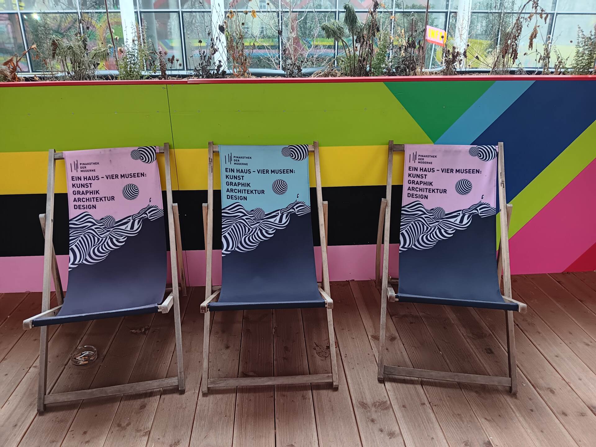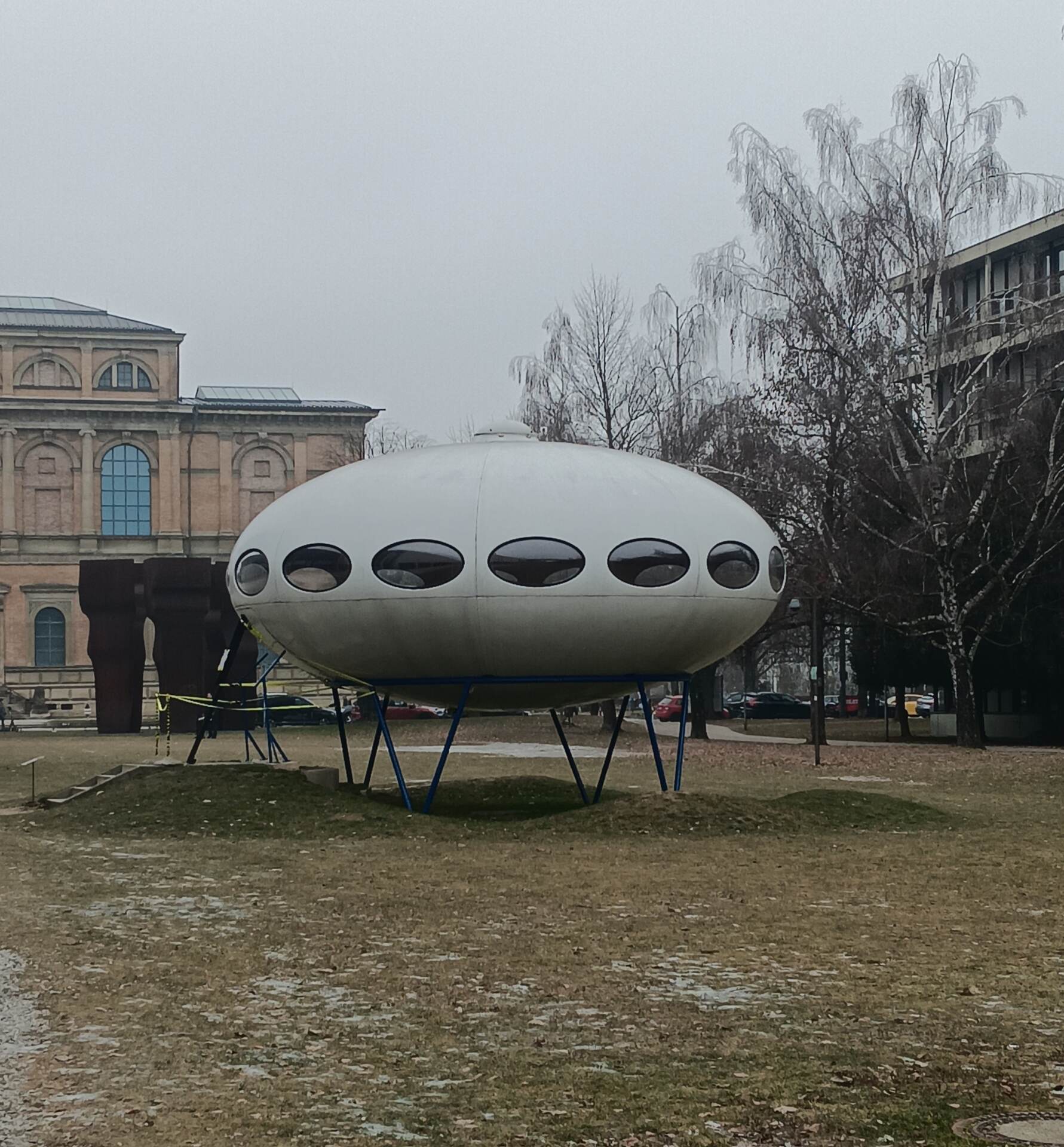 Unter dem Motto „Sonntags ins Museum“ entkamen wir dem Schmuddelwetter und verbrachten eine unterhaltsame Zeit in der Pinakothek der Moderne. Zuvor machten wir allerdings einen kleinen Spaziergang – beginnend am Stachus gingen wir „hintenherum“ zu unserem Ziel. Rund um das Gebäude entdeckten wir Interessantes wie zum Beispiel eine an ein Ufo erinnernde mobile Skihütte, die vor der Pinakothek der Moderne steht als architektonische Besonderheit. Auch der neue Kulturtreff FLUX weckte unsere Neugier. Im Sommer ist es bestimmt schön, auf der Terrasse was zu trinken, am Kulturprogramm teilzunehmen oder einfach in die Gegend zu schauen.
